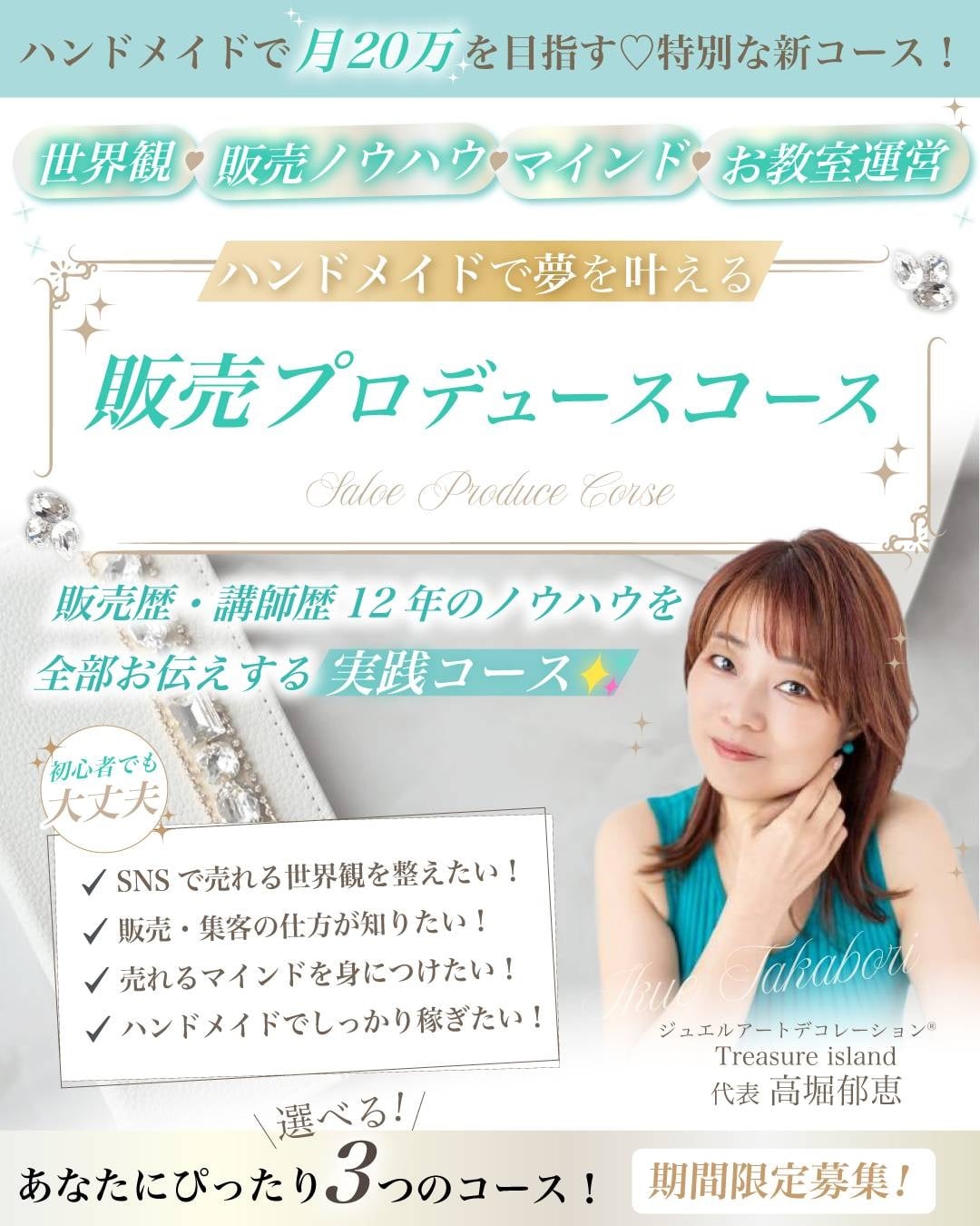 ジュエルアートデコレーション®ストーンデコスクール・オーダーメイド販売Treasure Island(トレジャーアイランド) 代表の高堀郁恵です。当サイトにお越しいただきありがとうございます。